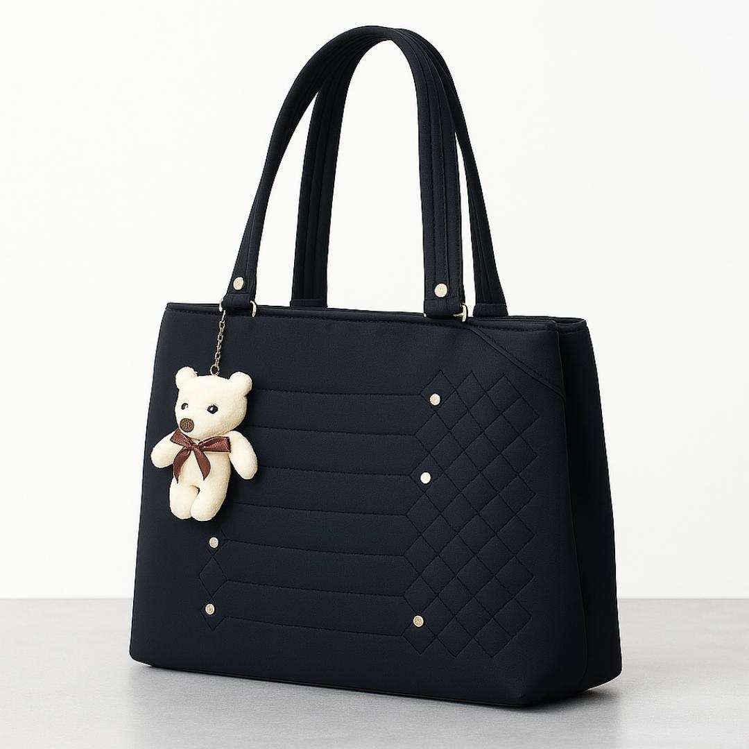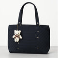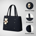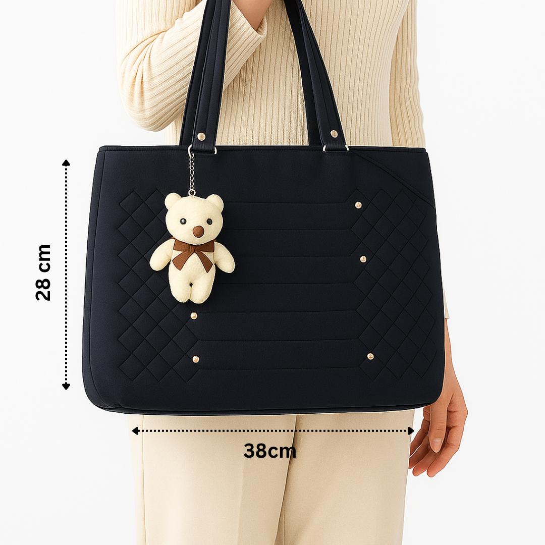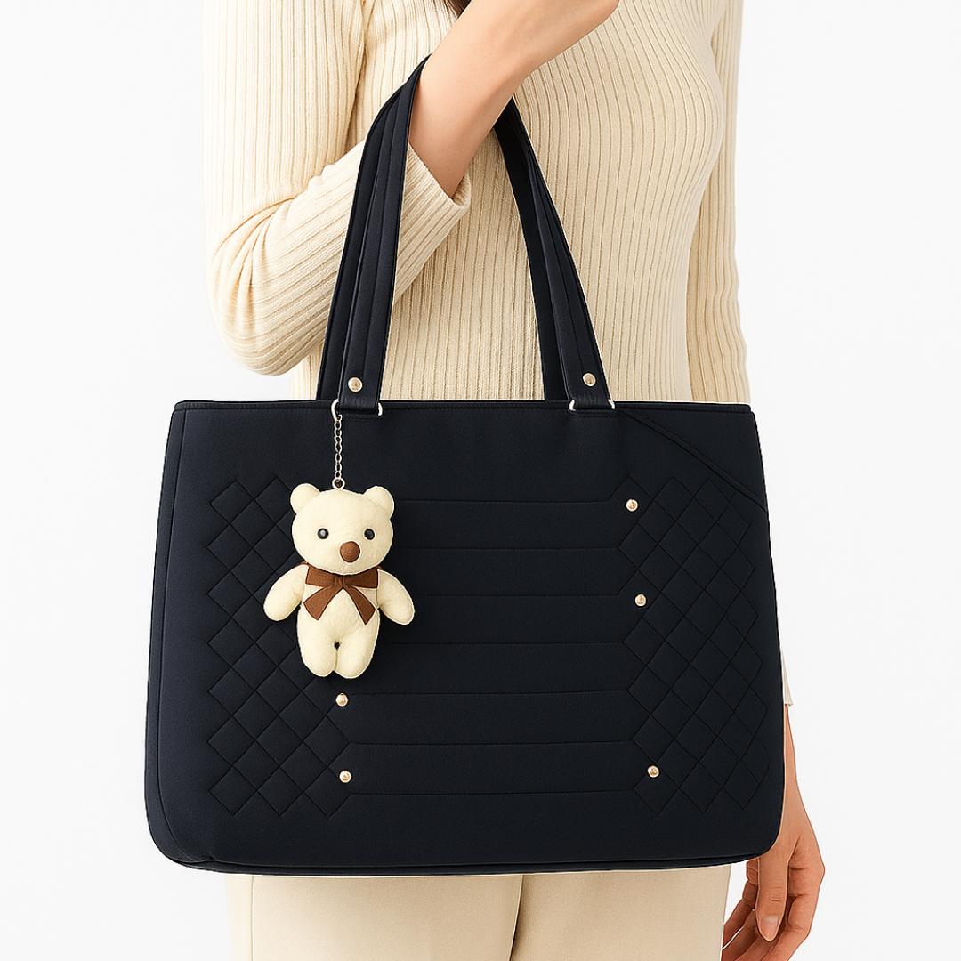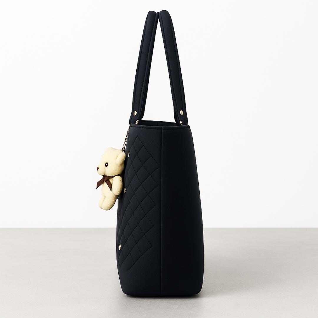 Add a touch of charm to your everyday look with the ORVELIE Quilted Tote Bag. Crafted in a rich black shade with elegant quilted detailing and gold-tone studs, this bag balances simplicity with style. The standout feature? A soft, adorable teddy bear keychain that adds a playful and youthful vibe to your ensemble.