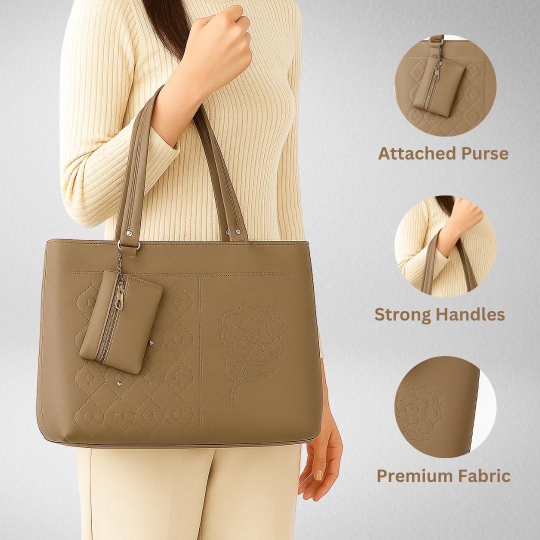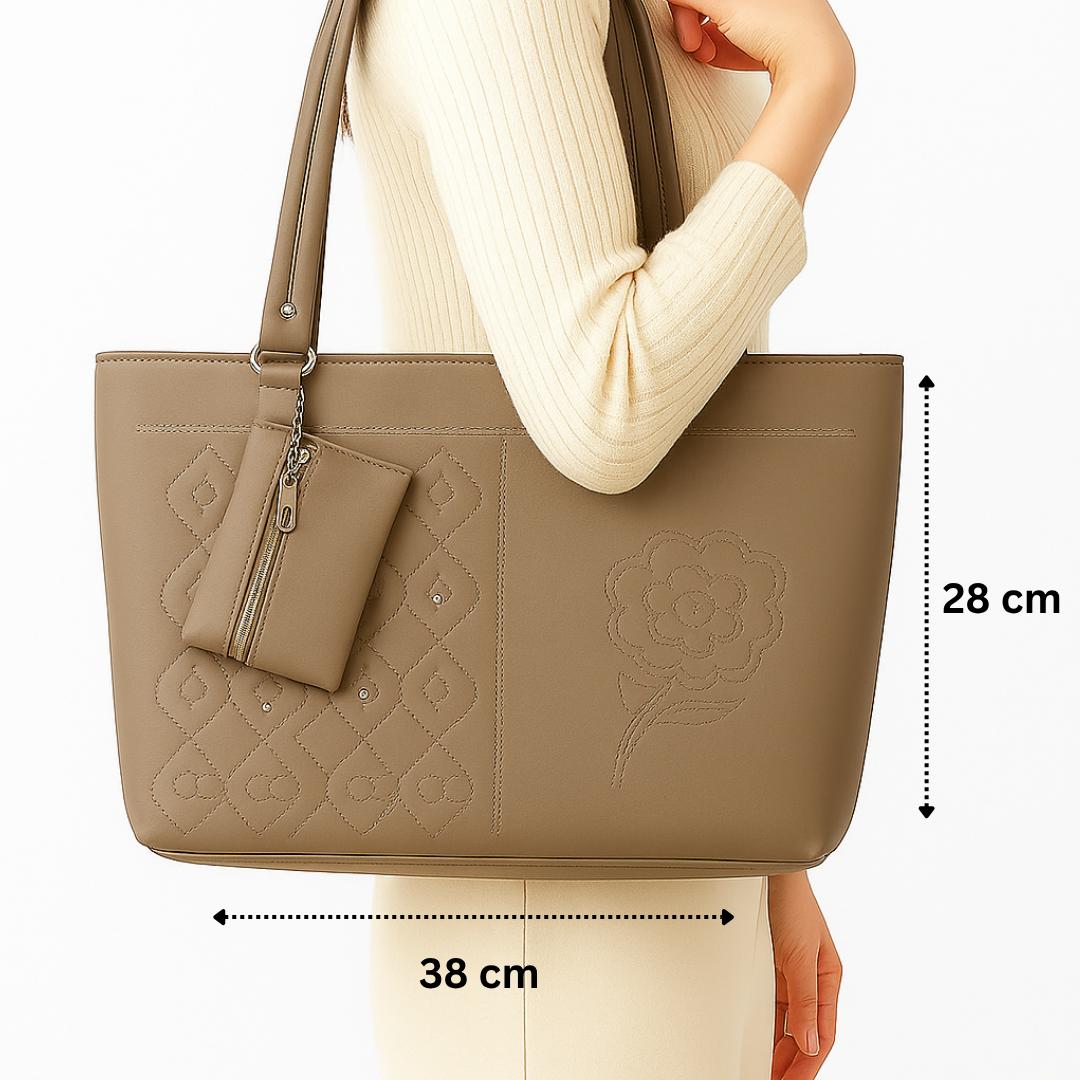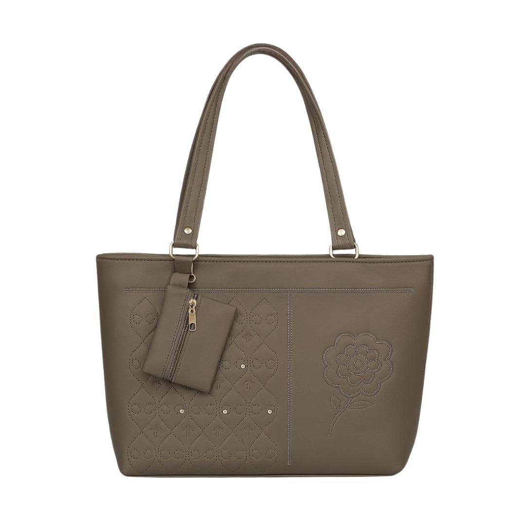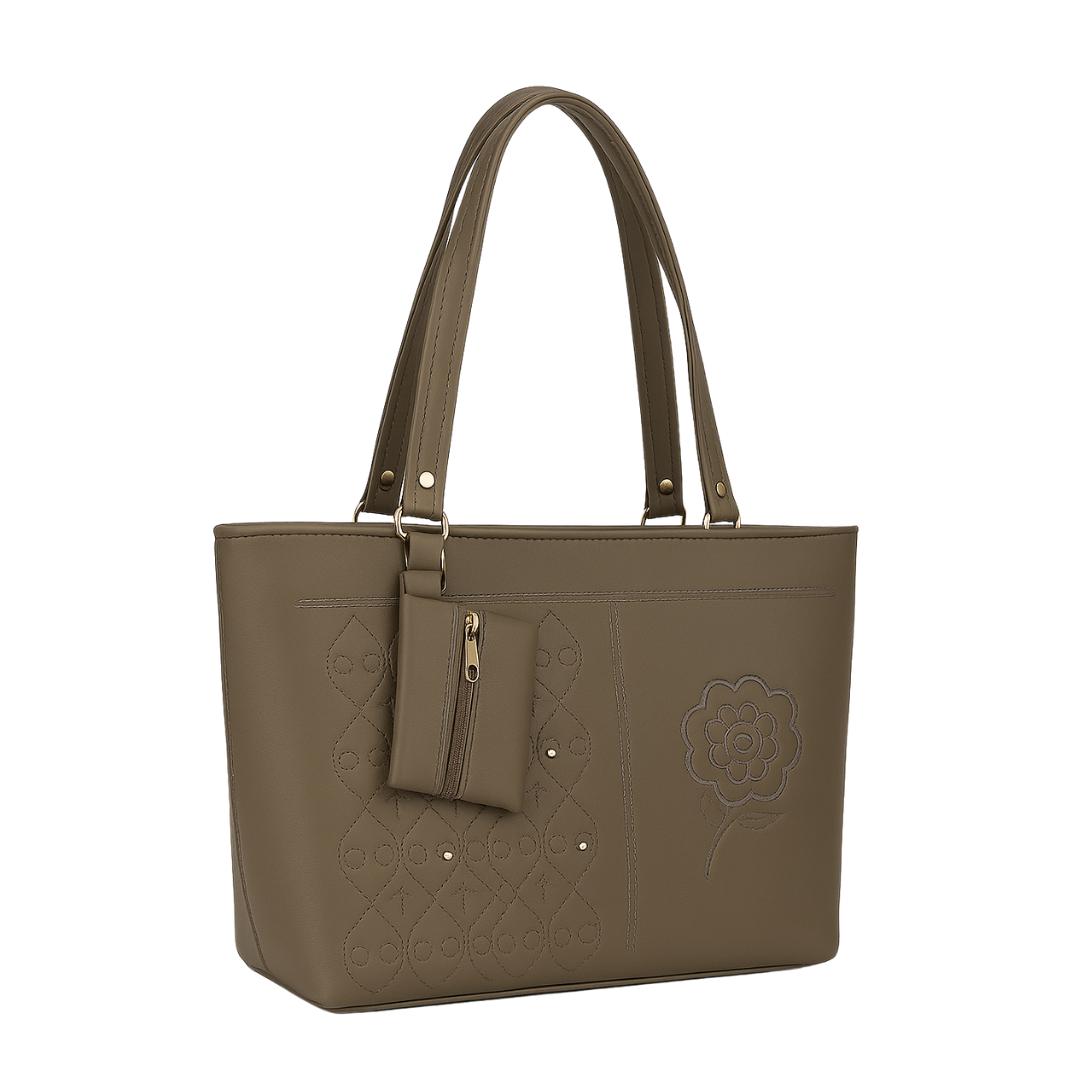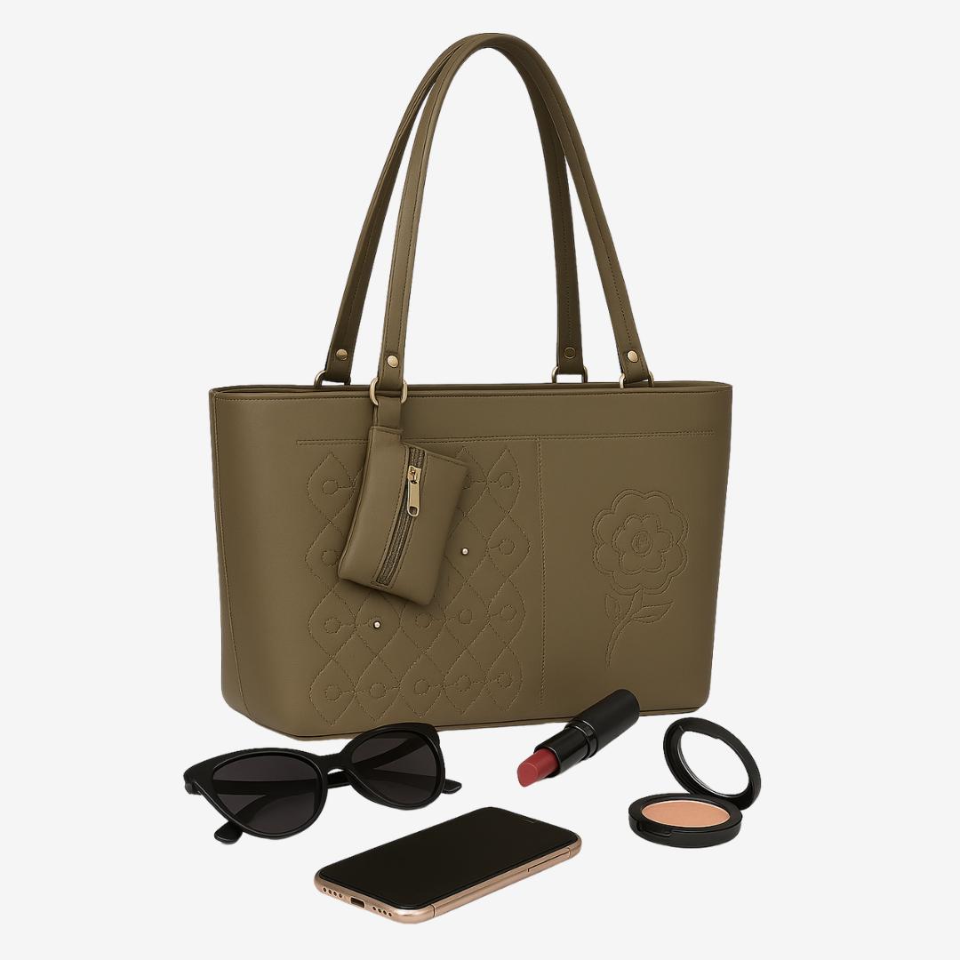 Elevate your everyday style with this beautifully crafted ORVELIE Tote Bag, designed to blend elegance with functionality. Made from high-quality faux leather in a classy olive tone, this bag features intricate embroidery detailing. including a floral motif and geometric stitched patterns that add a refined touch.